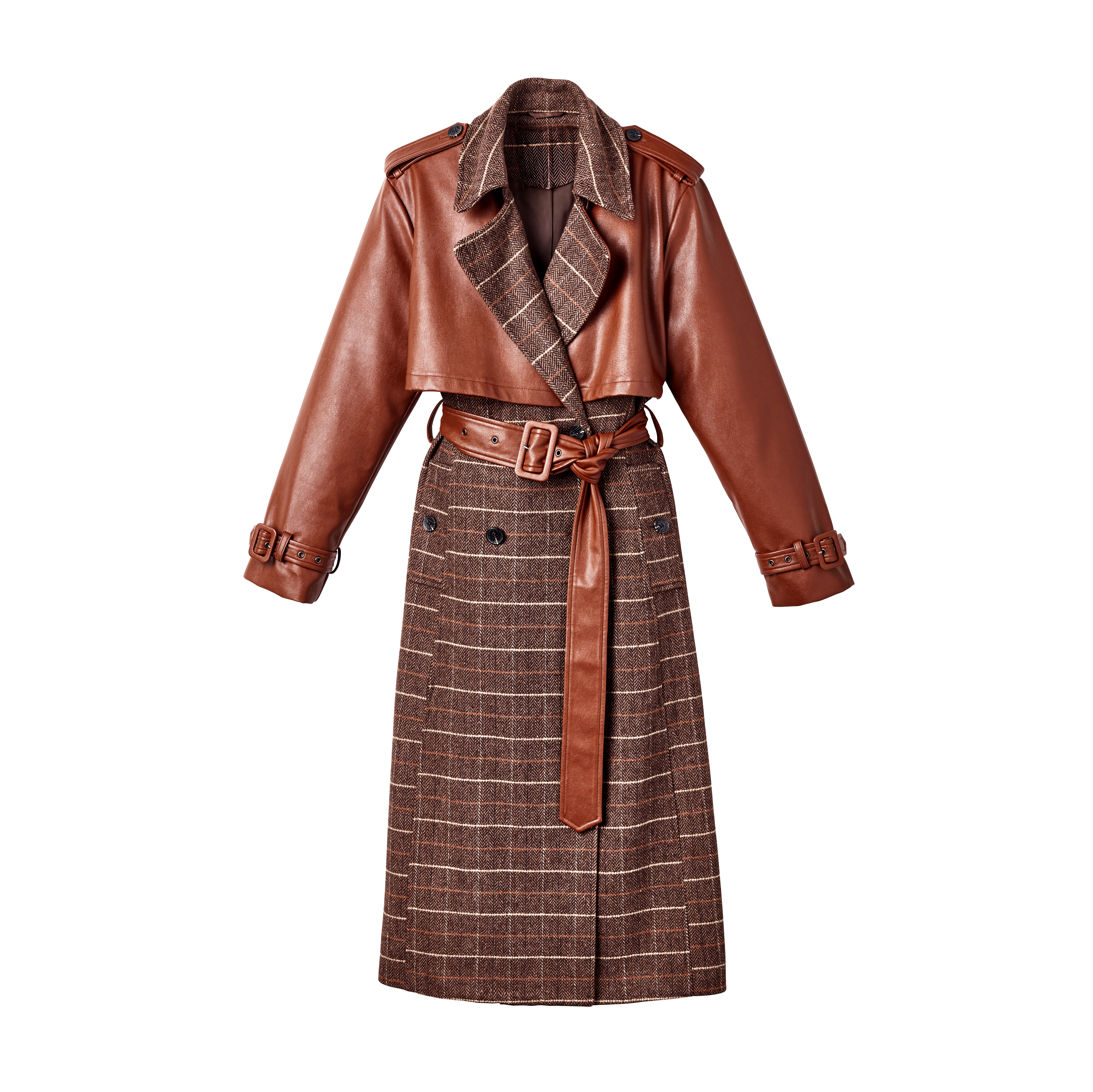 Trench à carreaux écossais avec ceinture en cuir synthétique